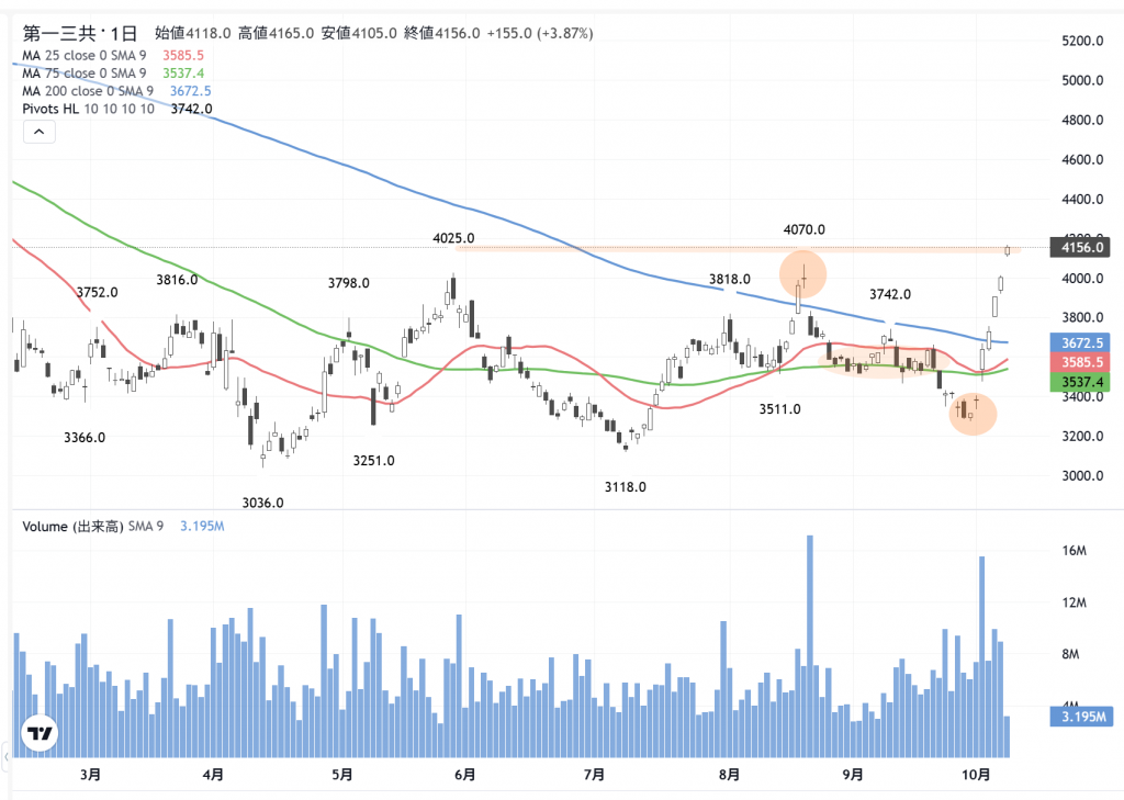 具体的には23日の祝日、以降の「戦略転換」です。あの23日の事前公約を実行する為に、「第一三共」(4568)や「レーザーテック」(6920)などの実験を諦めています。短期の時間軸まで完璧に読むために、カタル自身は更なる極みを目指し、完璧さを追求している為です。まぁその制約は良い面に働く可能性もありますが、今までの所、カタルの選択眼は正しく、ただ単に時間軸の違いなのですね。結局、両社は儲かっていますが、時間軸の選択で損をして、諦めました。でもみんな選択は正しかったことが、1か月以内に判明しています。「第一三共」なんか…本日も株価は高いのです。