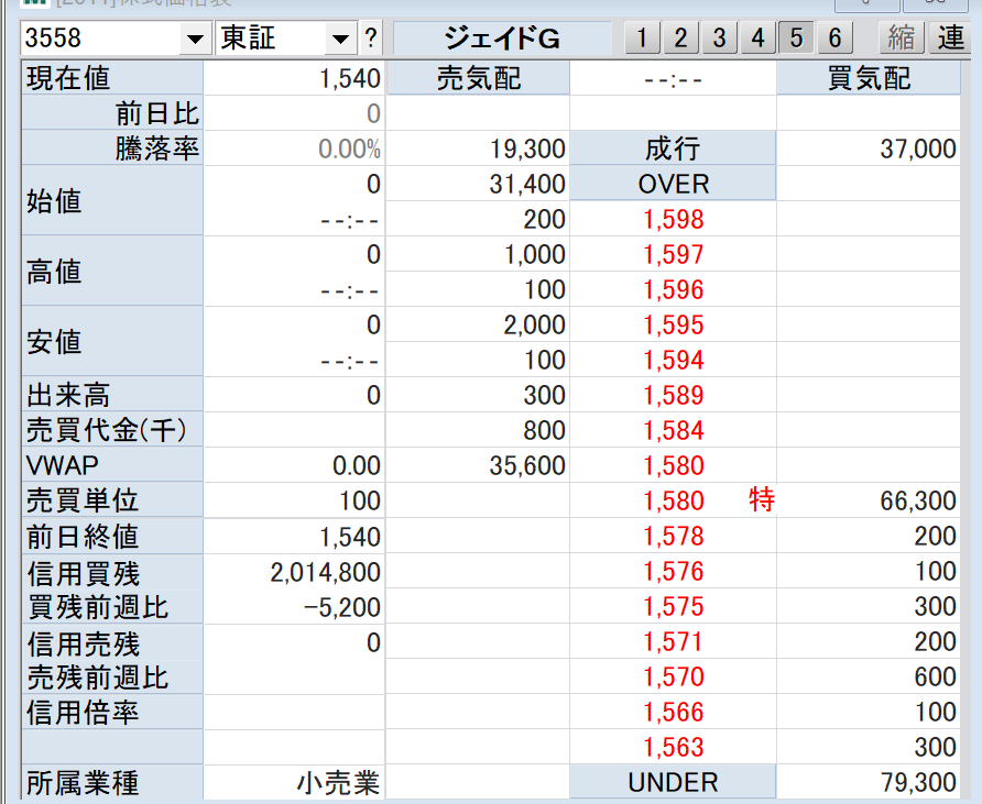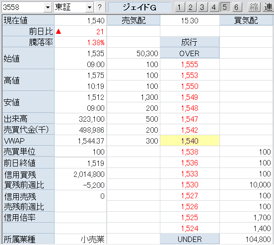 昨日、述べた「ジェイドG」(3558)は「買い気配」です。公約通り…500株だけは成り行きで買いに行っており、もう500株を追加で…1570円まで買いに行きましたが、既に「場の気配」は1580円の買い物です。皆さんは馬鹿なのでしょうか?