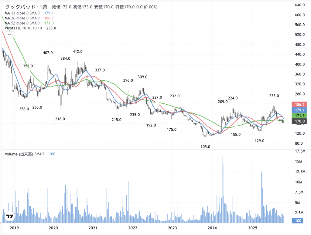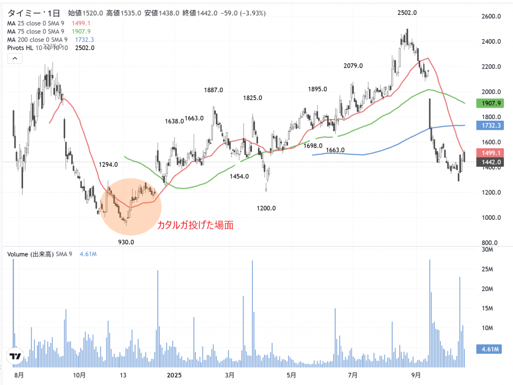 そうして「宴のあと」になるのです。カタルは過去に人気になった株が、「数年後」に大きく下がった株で…、論理的に考えて、「会社の価値がある」と言う株を…好みます。みんなが「見捨てた」株です。しかし過去の歴史において「輝かしい過去」があったのです。「クックパッド」(2193)は2880円まであります。「出前館」(2484)も「サイバーダイン」(7779)も…同じです。