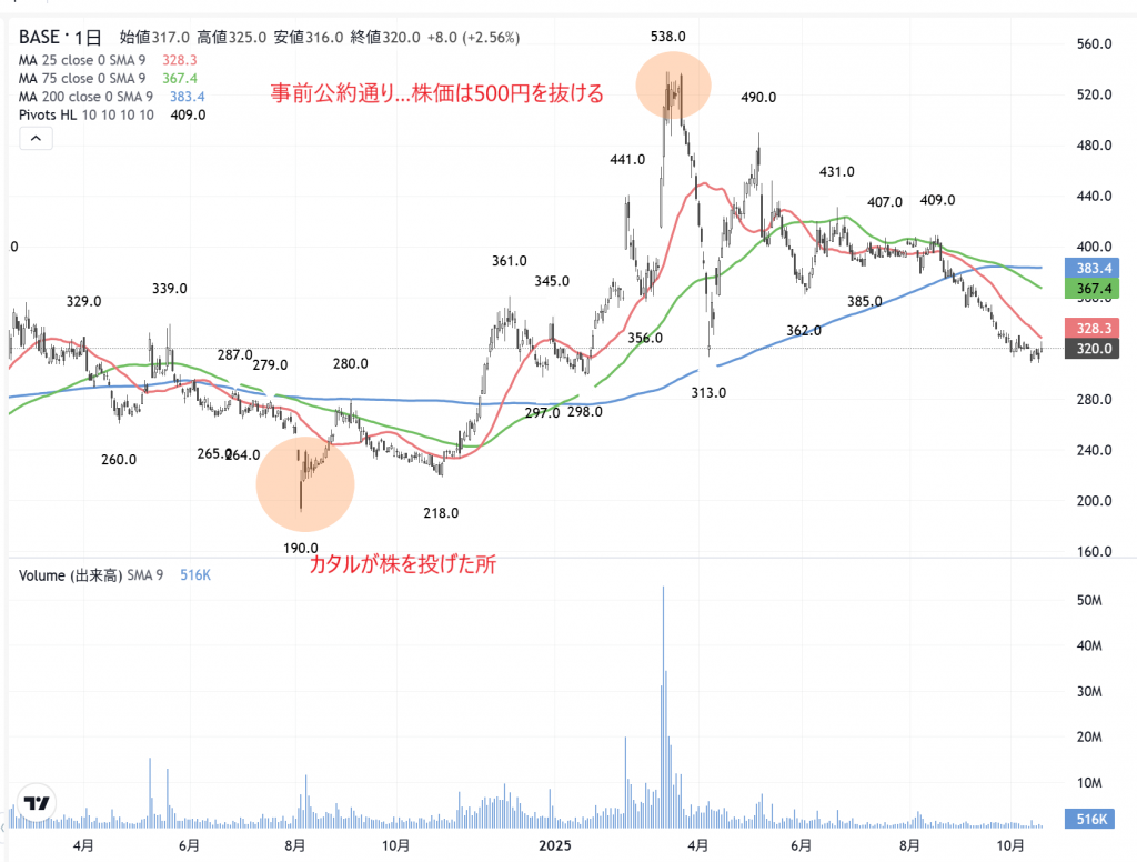 しかし…20万株を投げた「BASE」(4477)の株価は2倍以上になり…