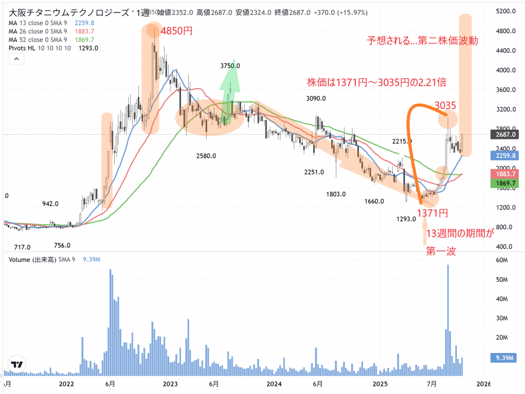 時代は「面白いもので」…「盆と正月」は、一緒にやって来るのでしょう。ようやく「ジェイドG」(3558)も、今回の決算修正で…「解禁期」を迎えます。「大阪チタ」ンも「増額修正」が、株価波動を変える「切っ掛け」になりました。その様子を週足で観てください。