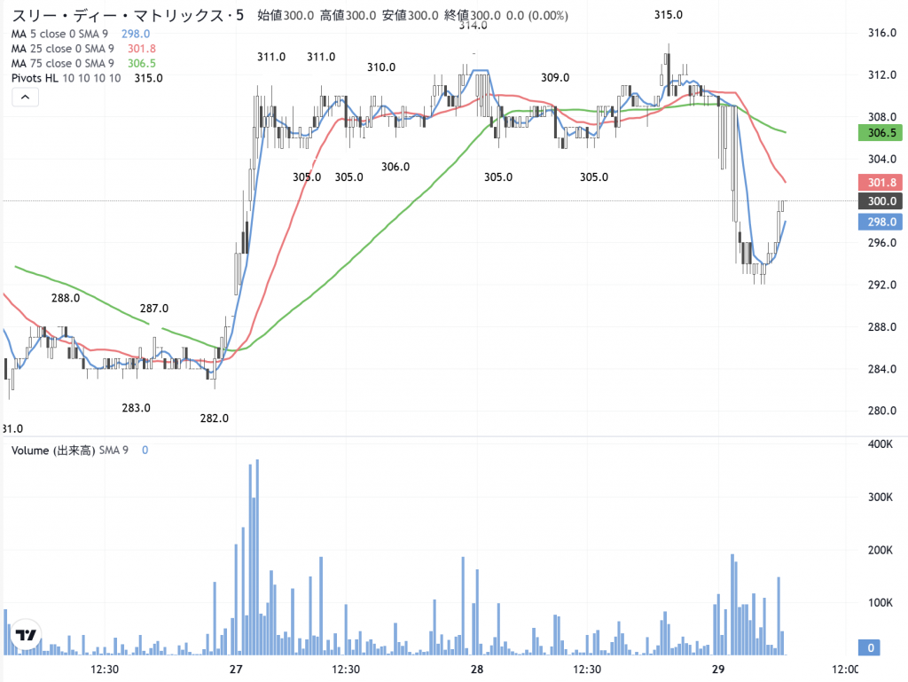 アレレ…さっき、バタバタ…株を買った「3Dマトリックス」(7777)の株価が安いですね。先ほど304円程度で2万株程かな? 株を買ったのですが、今は295円です。もう一回、下値を試すのでしょうか?