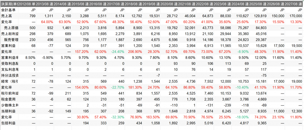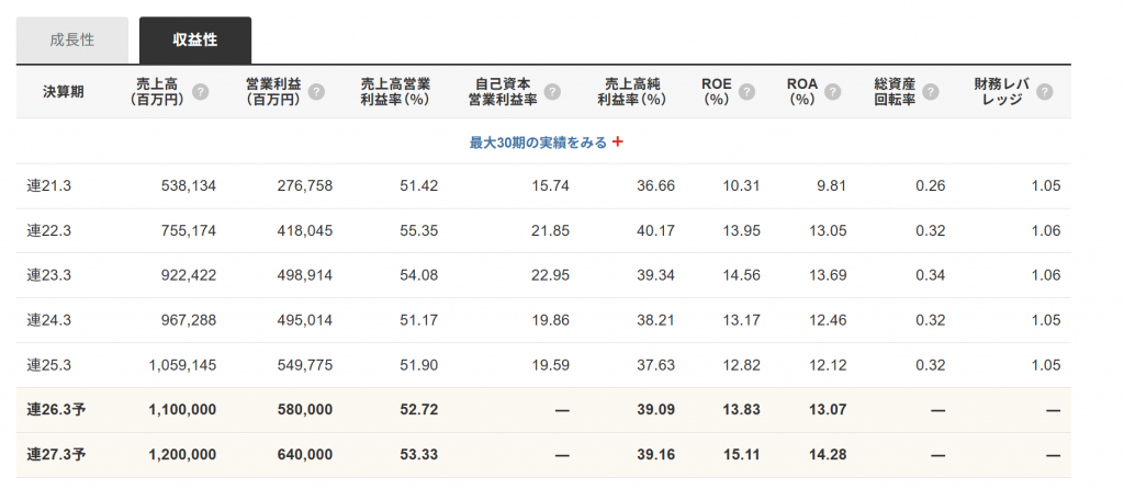 しかし流石に「売り上げ規模」が大きくなってくると、その成長度合いは止まります。ここ3年間の平均値は26.1%なのです。しかも…41.0%~35.6%~25.6%と言う具合で、右肩下がりの「じり貧」です。今期は僅かでもないのですが…17.3%の伸び率でした。その代わり…総体的に観て、徐々に「収益力」は高まっています。近年は10%台が定着しています。この水準はマズマズの合格ラインでしょう。