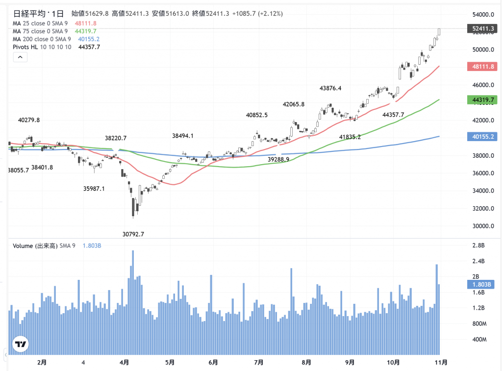 今の日経平均株価は、この乖離率が非常に高く…その200日線は40155円ですが、実際の日経平均株価は、なんと…52411円にもなっています。なんと…その「乖離率」は30.5%にもなっています。
