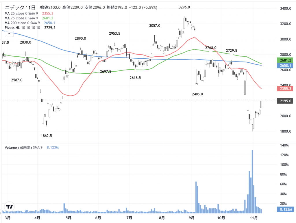 そのモデルケースの「ニデック」(6594)は、やはり…高いですね。監理ポストに入っていますから上場廃止を覚悟して取り組む必要がありますが、カタル好みの株です。もともと…の感覚は2700円の株でした。