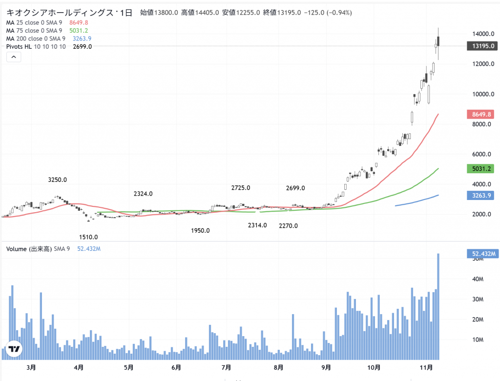 なかなか「立ち上がり型」相場の「キオクシア」(285A)のような事例は、「条件が揃わない」と生まれない相場です。カタル自身、前からの観察株ですから、株価は「上がる」だろうと言う漠然とした「相場観」は在ったのですが、ここ迄の「器」だとは、思っていなかったですからね。