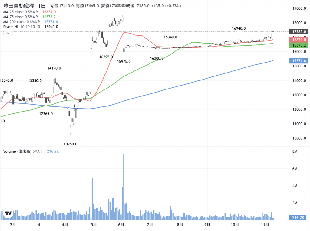 「豊田自動織機」(6201)の 日足