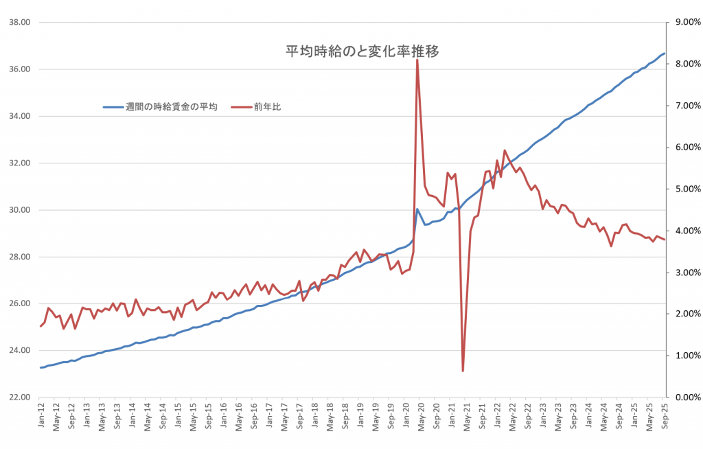 そこで…今回の雇用統計と失業率の関係と平均時給のグラフを久しぶりに、データを追加して作成しました。ご覧ください。自分で「作るなら」…更に、よく理解できます。