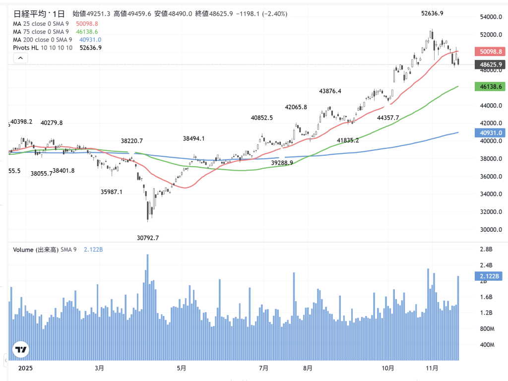 「値嵩株の影響」を強く受ける…「日経平均株価」は、1198円安の48625円となり「-2.41%」でしたが…「TOPIX」は、僅か1.84ポイント安の3297.73で、その値下がり率は、僅かに-0.06%でした。だから今回は単なる…乖離調整だろうと考えており、臨時号を出すまでもないかな?と言う感覚は正しいのでしょう。