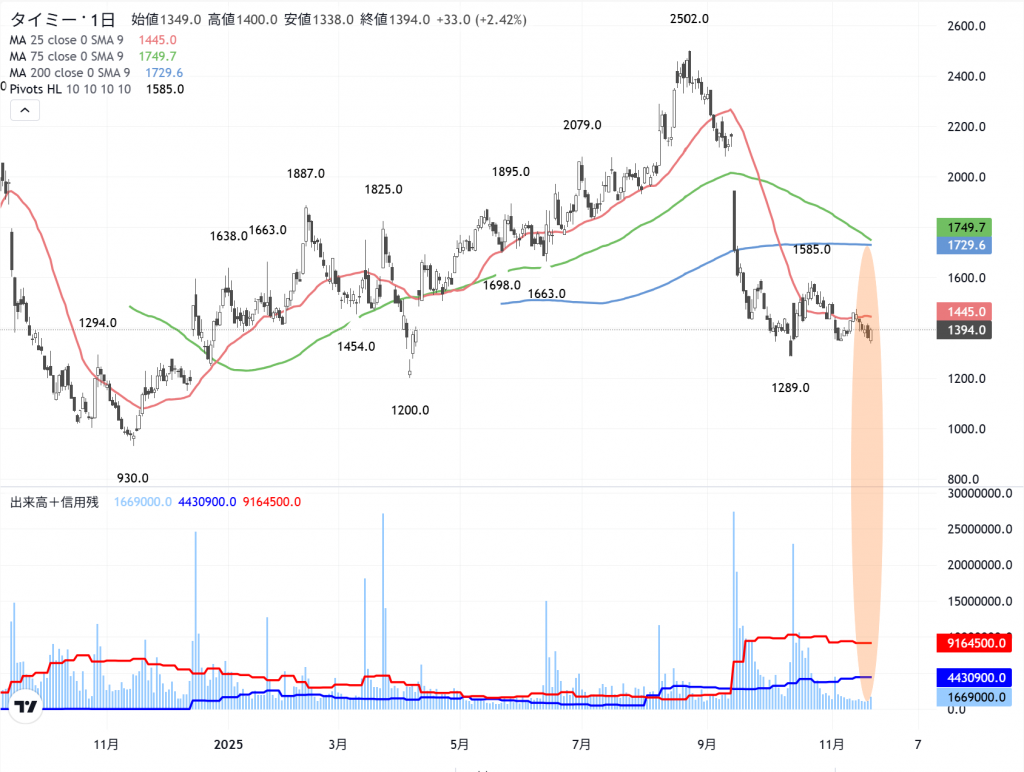 「タイミー」(215A) の日足と貸借株動向
