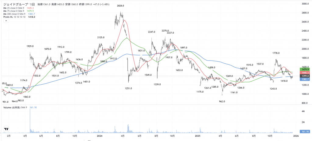 時間軸を延ばした「ジェイドG」(3558)の日足