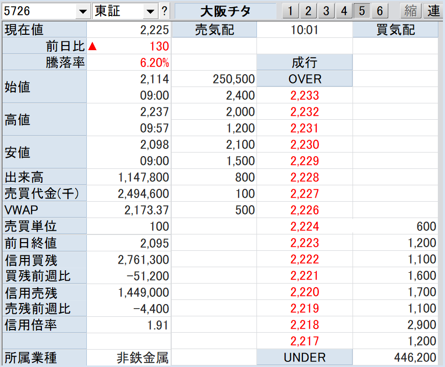 やはり「大阪チタン」(5726)は、始まった可能性があります。開始かな?…と思ったから、6日の大引けで500株ずつ…3本の買いを入れましたが、昨日は「定石通り」下げていました。だから、更に大引けの2095円で500株、これは恐いから1本だけで…本日は2060円でもう500株の指値を入れたのですが、寄り前の気配値2070円前後ではなく、2114円と…高く始まって、今は2208円まで来ています。