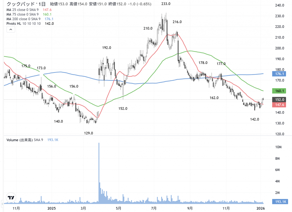 昨日、久しぶりに「クックパッド」(2193)を153円の大引けの株価は5000株だけですが買いました。たぶん…下値に届いたのでしょう。一応…そう判断をしています。今日は149円に5000株、そうして146円にも5000株の買い指値を入れました。