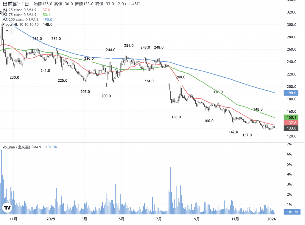 ついでに、まだハッキリしない「出前館」(2484)に…こちらは135円、134円、133円に1000株ずつの買いを用いて、130円にも2000株の買い物を用いてみました。韓国企業の成功組が乱入して競争は激化しており先が見えません。毎年50億円の赤字ですから、「金の切れ目が縁の切れ目」です。