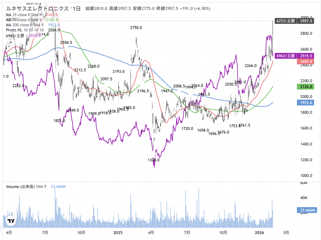 例えば木曜日に…TICK回数第一位に輝いた今年の本命株として位置づけした「ルネサスエレク」(6723)にしましょうか…。このチャートはルネサスを主体にして、紫の線がロームの株価の値動きですね。