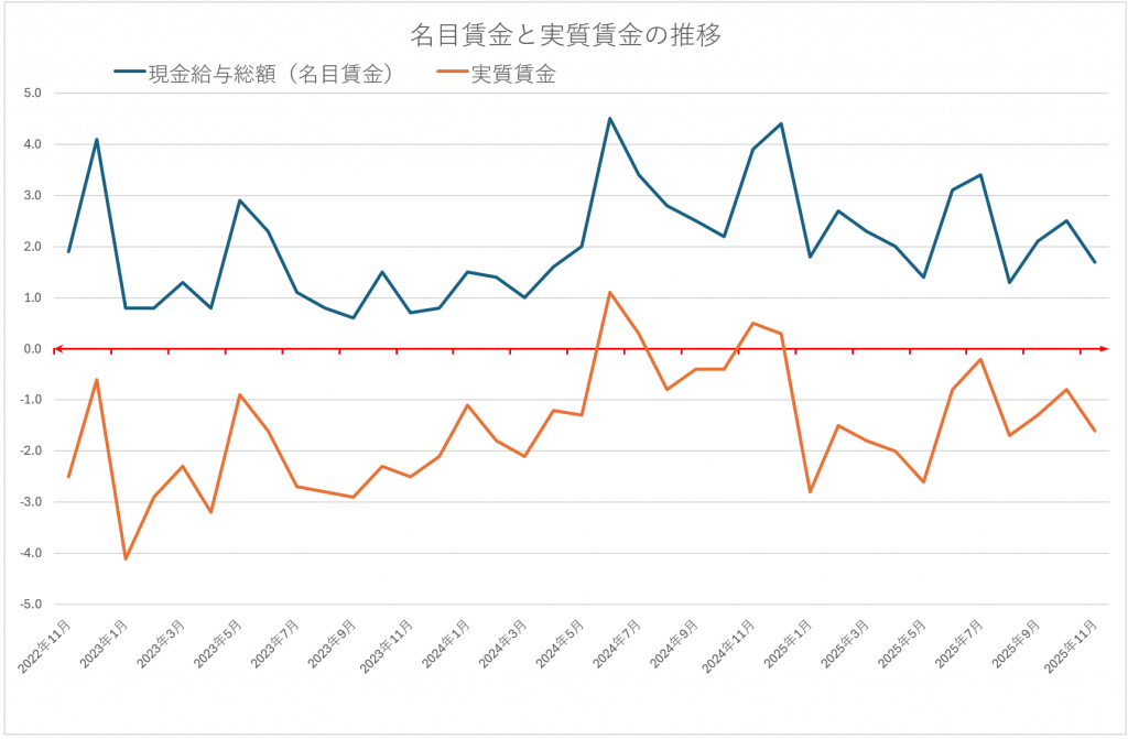 カタルは、今は名目経済を「完全に軌道の乗せるために」走り出すべきだと考えています。だから高市さんに「アクセル」を更に踏み込んで欲しいのです。何故なら、彼女の批判記事は「現状に合わない」と思っている為です。その理由は「実質賃金」動向にあります。まもなく12月の数字が発表されますが、ボーナス月なので…実質賃金もプラスに転換する可能性もあります。
