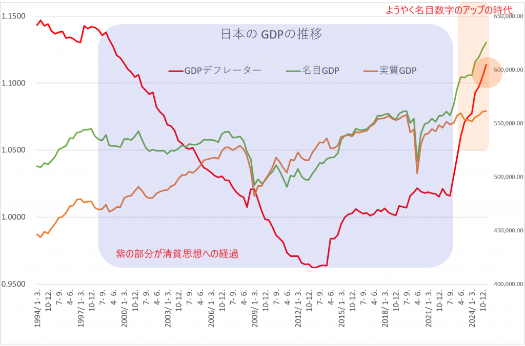 カタルは「夢や希望」が、語れる前向きな社会を望みます。多少、バブル気味でも…今は、丁度、良いのでしょう。だって「GDPデフレーター」を観ると分かります。ようやく…名目値が上がって来ました。これを、更に上げると…自然に「実質値」も上がるのです。日本のGDPデフレーターは上がって来たと言っても…「112.7」(グラフでは1.127)なのです。