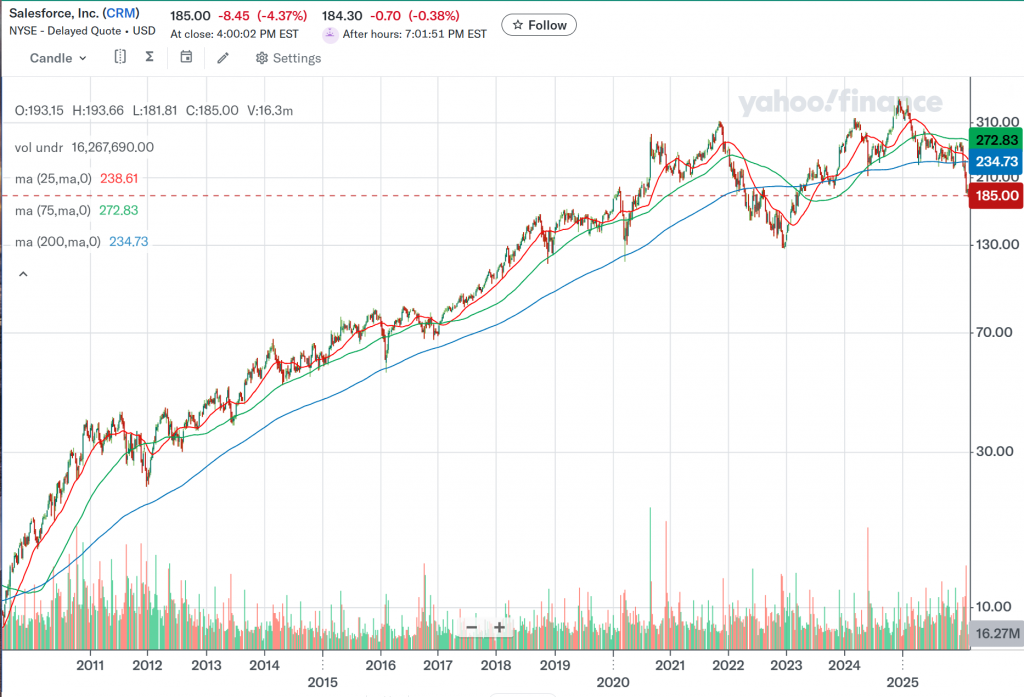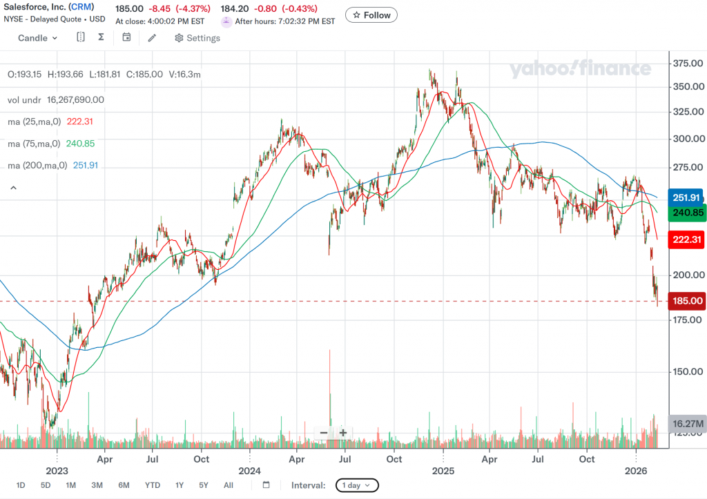 そうして、ようやく「適正ライン」に株価が下がって来たようにも、感じています。その代表格の米国のセールスフォース(CRM)の日足と週足を掲げておきます。