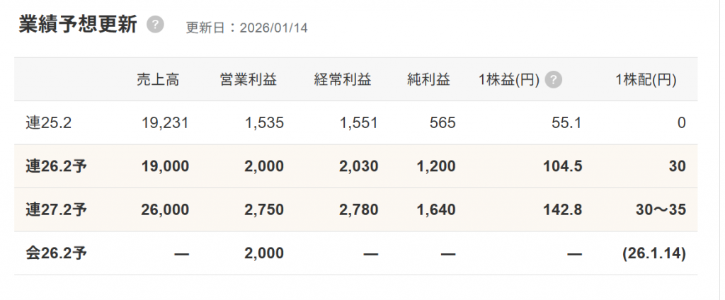 つまり…あっ、やはり変わりました。その四季報予想は、2027年2月の売り上げ予想は260億円に訂正されています。そうして営業利益も、妥当な予測の275千万円になっています。