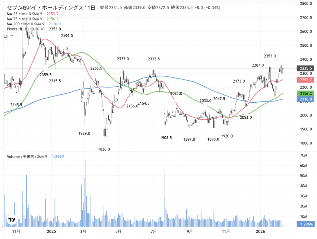 「東芝」が上場廃止に追い込まれ…。 1年前かな? 今度は7&IHD(3382)がターゲットと思ったけれど、MBOの資金がなく上場が維持され、最近は、株価にも変化が出てきましたね。この株価の2335円と言うのは、あの時の高値ラインに来ているのではないかな? いや…高値は2703円があったのですね。まだもう少し…間があります。