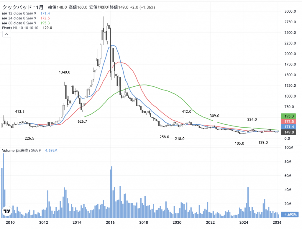 自分が、どの「株価位置」で、目先勝負を張ったか、どうか…その認識がない馬鹿です。今日も買い物を入れましたが、始まりは149円ですから…買えないようです。金曜日は145円が買えたのです。このクックパッド(2193)も、一時は馬鹿高値(2880円)を付けた株です。ですが、赤字の継続で、株価は適正ラインになって来ました。だからカタルの観察株になっています。そうして時折、この株価波動を利用しています。
