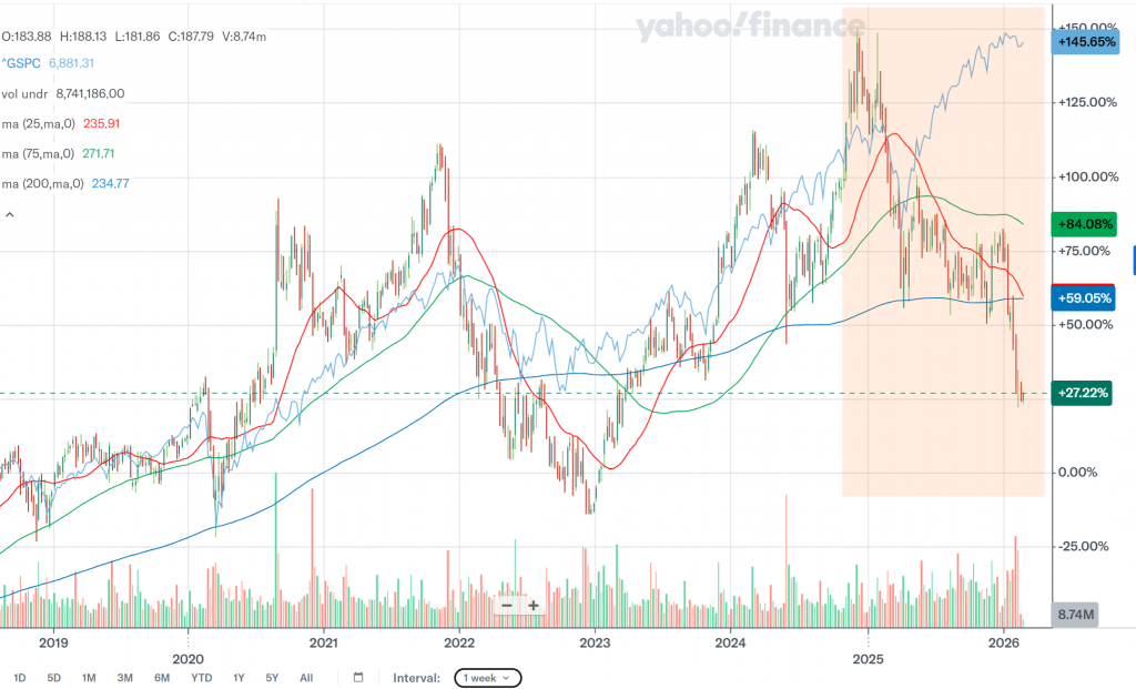 だから…カタルは、休みに「SaaSの死はチャンスかも…」と言うレポートを書きました。この記事の中で「セールスフォース」(CRM)とS&P500かな? その比較チャートがありました。この記者の報道は嘘ではありません。本当です。