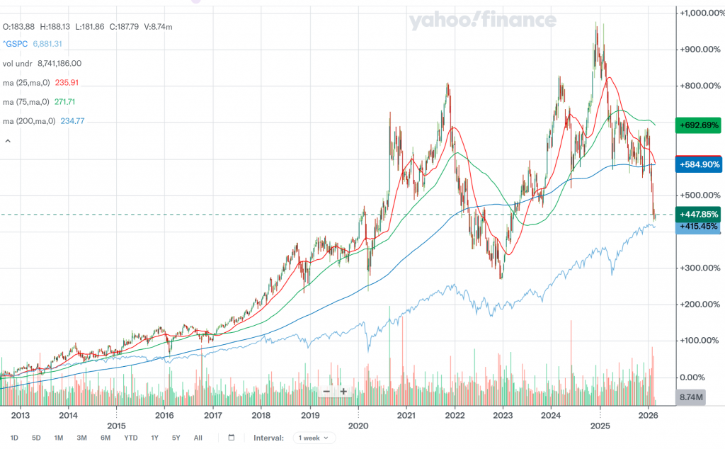 セールスフォース」(CRM)とS&P500 (青のライン)の週足