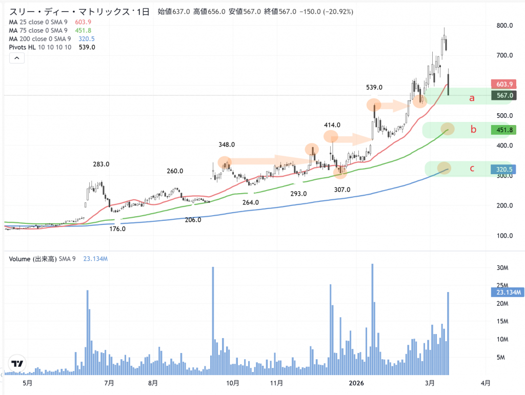 株の買い方は、人、それぞれ…です。自分の力量問題ですが、先ずは。昨日に大引けの株価567円と前の下値が538円と高値が539円ですから…このaのラインと、bの75日線の451円程度と…前の高値は414円です。この辺りまで見込んで投資をします。魔坂…いきなり200日線まで…到達するのは、無理があるでしょう。基本は「良い決算数字」なのです。