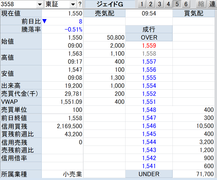 今日は1550円のジェイドG(3558)が買えたので、もう…500株を買いに行きました。この1546円の1万株程度の買い物は「見せ玉」の可能性と…寄り値で売った連中が買い直している可能性があります。カタルも良く使う…手法です。