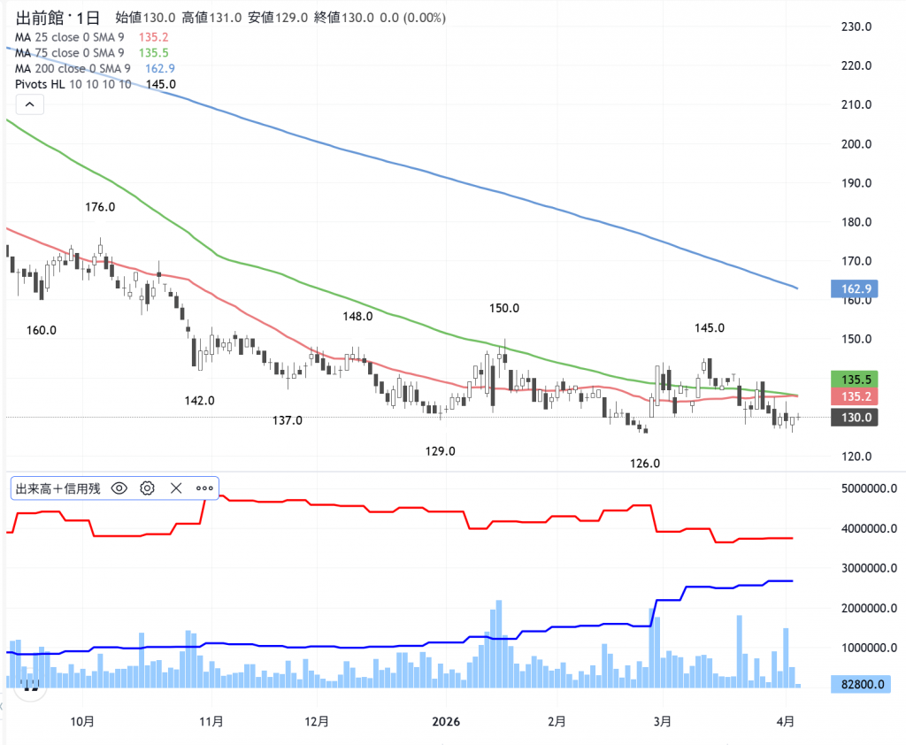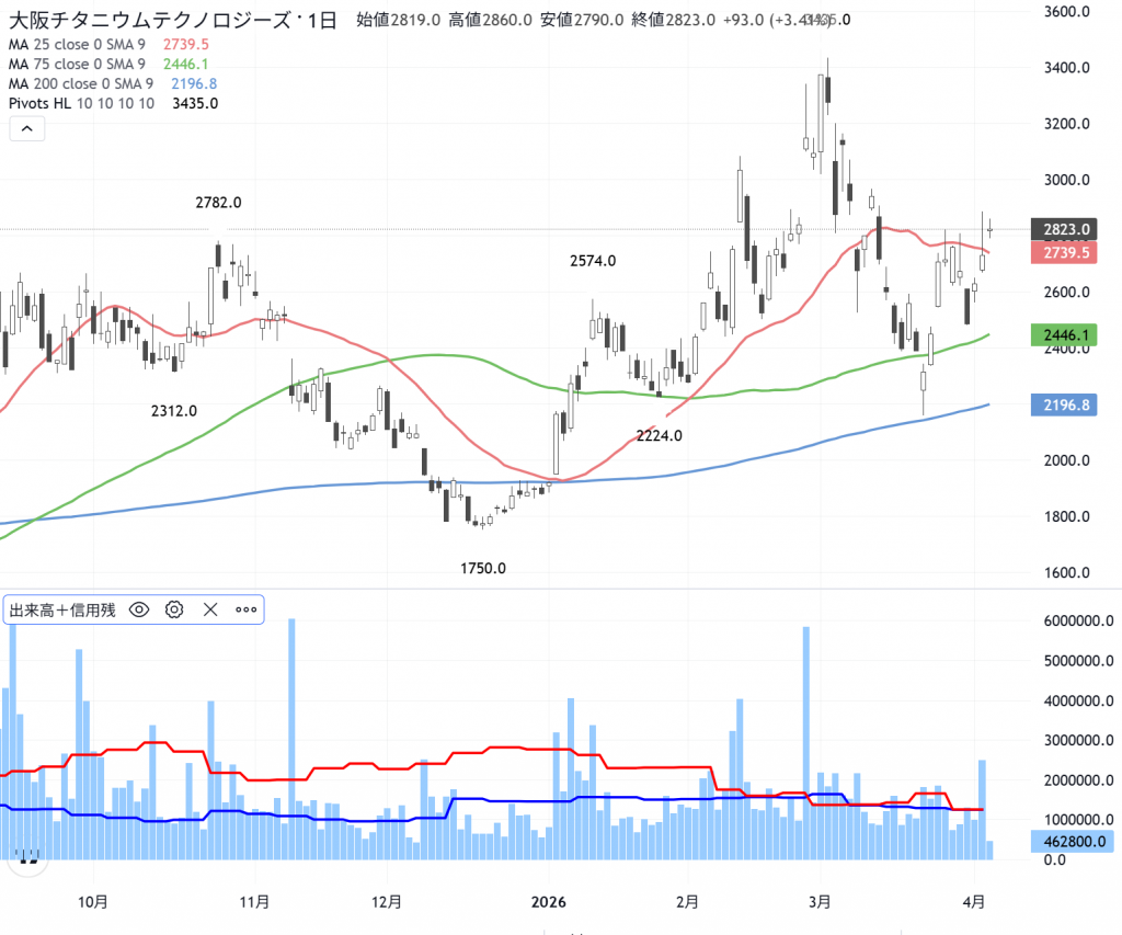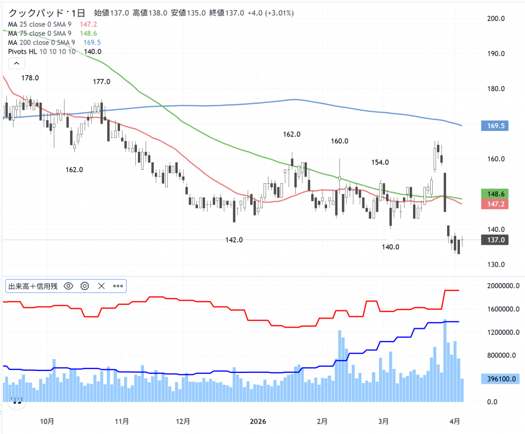 カタルは「空売り野郎」をやっつけろ!と信用の取り組みが、接近した…株価位置の低い銘柄を掲げています。大阪チタン(5726)、タイミー(215A)、そうして…クックパッド(2193)、出前館(2484)の低位株です。