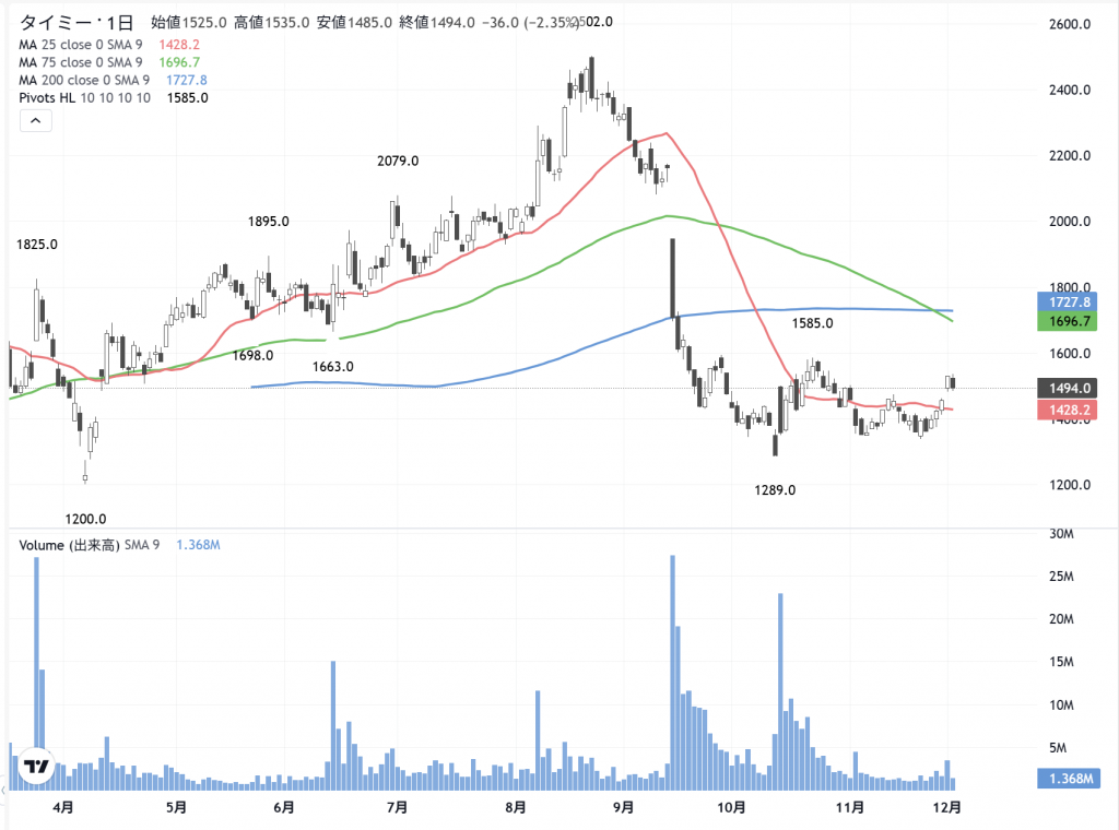 下値のもので興味を持ってもって観察しているのは「タイミー」(215A)と「SHIFT」(3697)です。「タイミー」は割高に見えます。でも空売り筋が関与しており、「相場のアヤ」として、「大阪チタン」(5726)の1500円台から3035円へ株価が伸びた「空売り筋の踏み相場」が見られる…可能性が在ります。