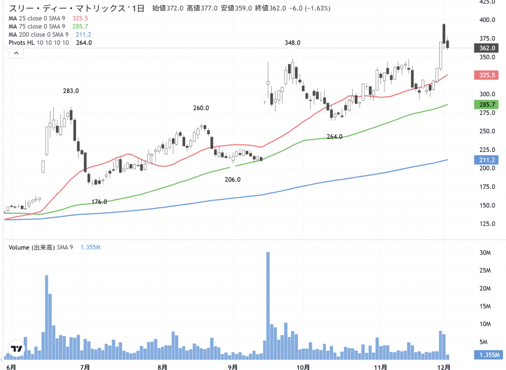やはり「3Dマトリックス」(7777)は、高く…始まったのですね。372円の開始です。本当は…カタルなら375円から380円からスタートさせたでしょう。そうして一気に「煽り」ますが…果たして、時間なのかどうか…彼らの「手の内」によるのです。年末は坊さんも走り回るほど忙しいから「師走」と言います。独特の年末の空気が市場にはあります。何か…一発高が欲しいですからね。ITバブルのように…ここから10倍は望みませんが、せめて2倍や3倍の「餅つき相場」が始まっても…良い頃です。