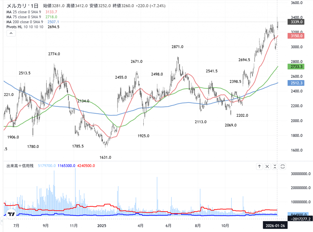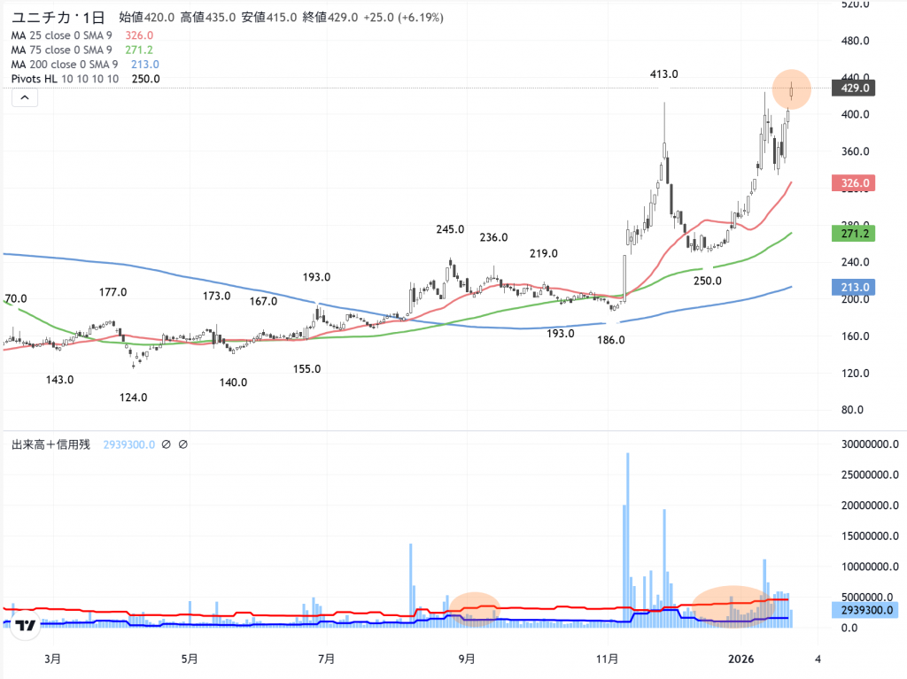 でも「ユニチカ」は、新高値ですよ。昨日は久しぶりに…昔のカタル銘柄の「メルカリ」(4385)も人気になっていました。あの時は「ソフトバンクG」(9984)と「メルカリ」(4385)、そうして「BASE」(4477)に「ジェイドG」(3558)でした。