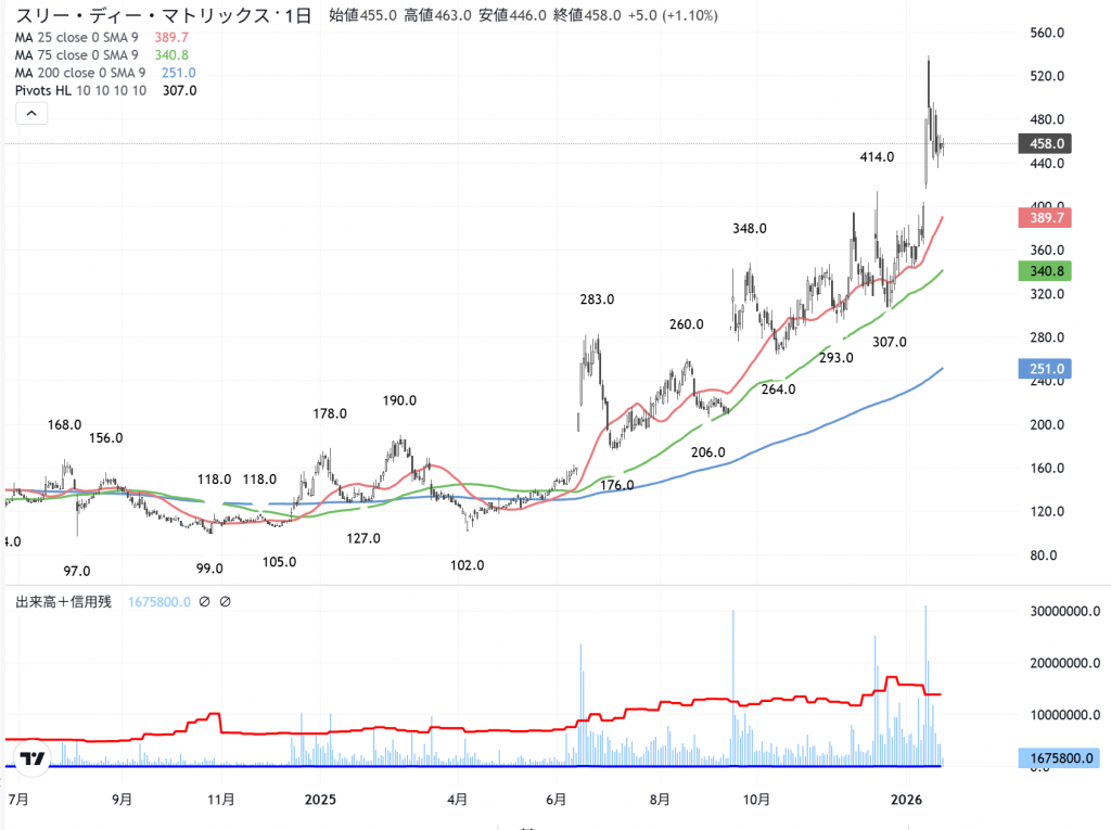 今、448円の「3Dマトリックス」(7777)を5000株にしようか…、どうしようか…迷ったけれど、2000株に「自重」しました。この理由は「ジェイドG」(3558)の1700円が500株ずつ…合計1000株買えたからです。
