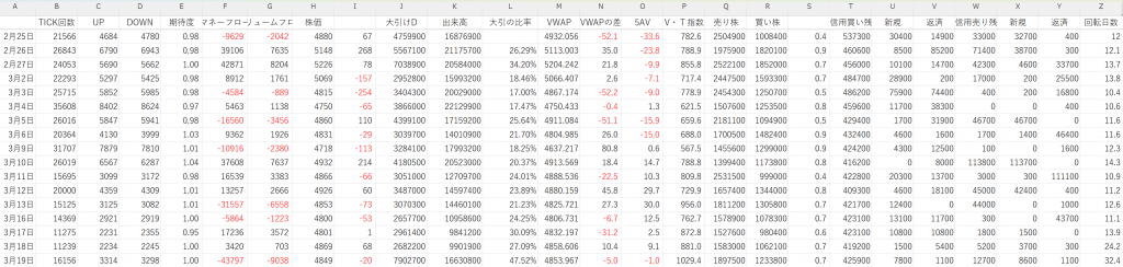 何故か…大引けの出来高が、どの株も膨らんでいました。これは日立の株価データです。大引けだけが「特別に」出来ています。通常は…20%程度の出来高なのですが、何故か…金曜日は、その比率47%に跳ね上がります。自分で電卓を叩くと分かりますが…簡単な作業ですから、エクセルで大引けの一日の総出来高に対する「比率」も加えましょう。皆さんは、たぶん…疑問にも感じないし、自分で計算する人も居ないでしょうから、カタルが便宜を図りましょう。