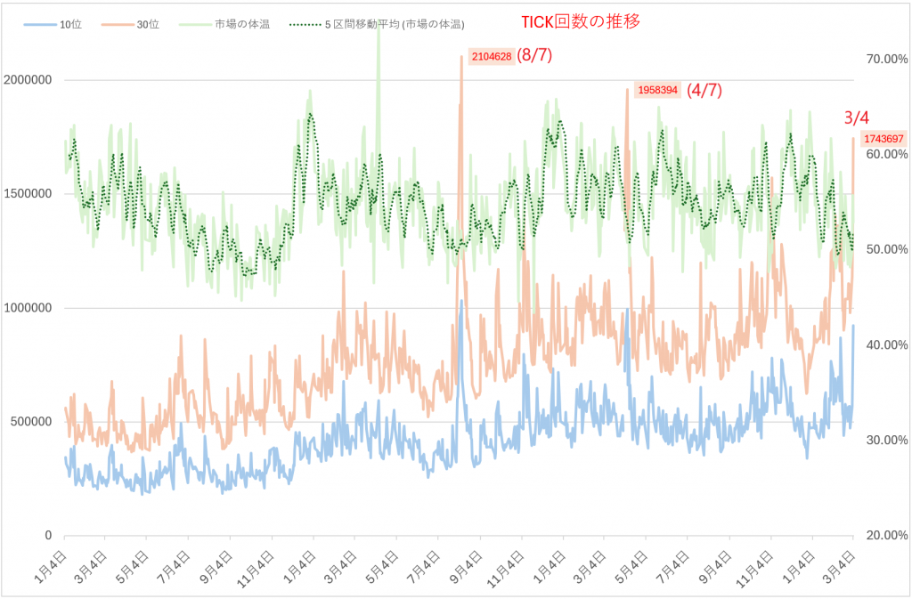 既に昨日、TICK回数に変化が出ています。そのグラフを付けておきますか…。何より投機性を示す「ビットコイン」も…大幅高していました。市場の整合性の観点から峠を越えた可能性が見えます。自分がどんな投資をしているか? 昨日の相場でも動揺せずに…平気で株を買い続けられるなら、自分の取って適正な持ち株水準なのでしょう。