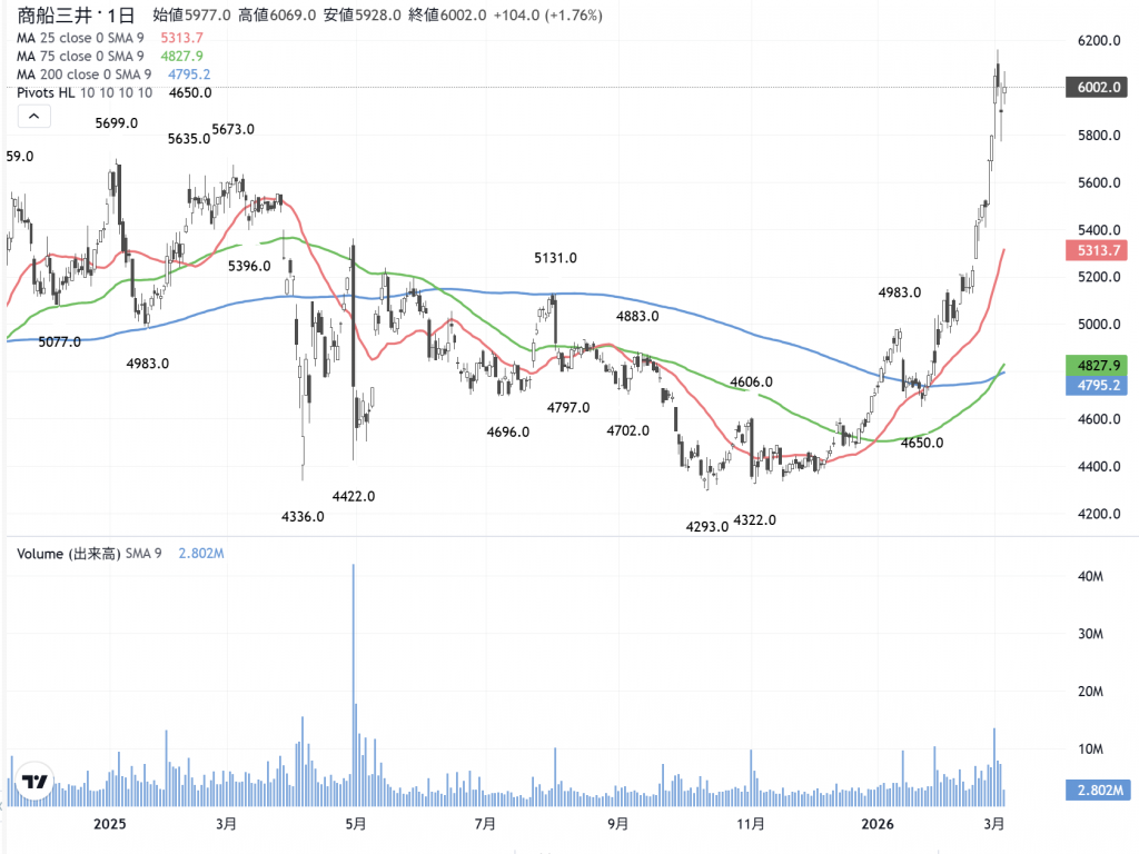 株価の上昇パターンを観ると分かりますよ。本来、カタルは今でも「船株の謎」の話を良くしています。まだ純資産価値を回復してないと思います。そうですネ。商船三井(9104)のBPS(一株純資産)は7523円です。今でも3%配当で…黒字なのですよ。何故、純資産価値以下の6045円なのでしょう。これから、どんどん…「赤字」になるのですか? 確かに…「市況もの」ですが、少なくとも純資産価値を回復するのが「道理」でしょう。