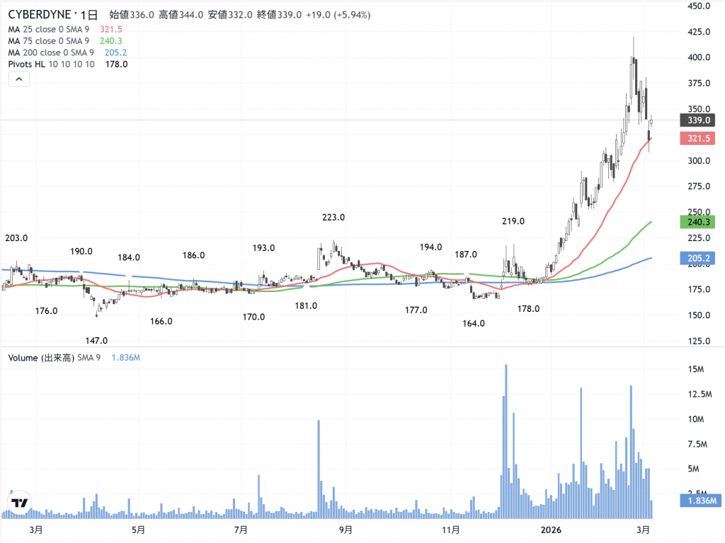 今、サイバーダイン(7779)は正念場に株価は位置しています。昨日は338円だったかな? 3000株を買い、もう3000株を318円かな? 買おうと思ったら担保が足りず2000株にしたのですが、今日はその高い方を345円で売りに行っていますが、まだ売れません。問題は出来高推移なのです。出来高が大きく落ち込まずに人気を保てるなら一段高が確定します。