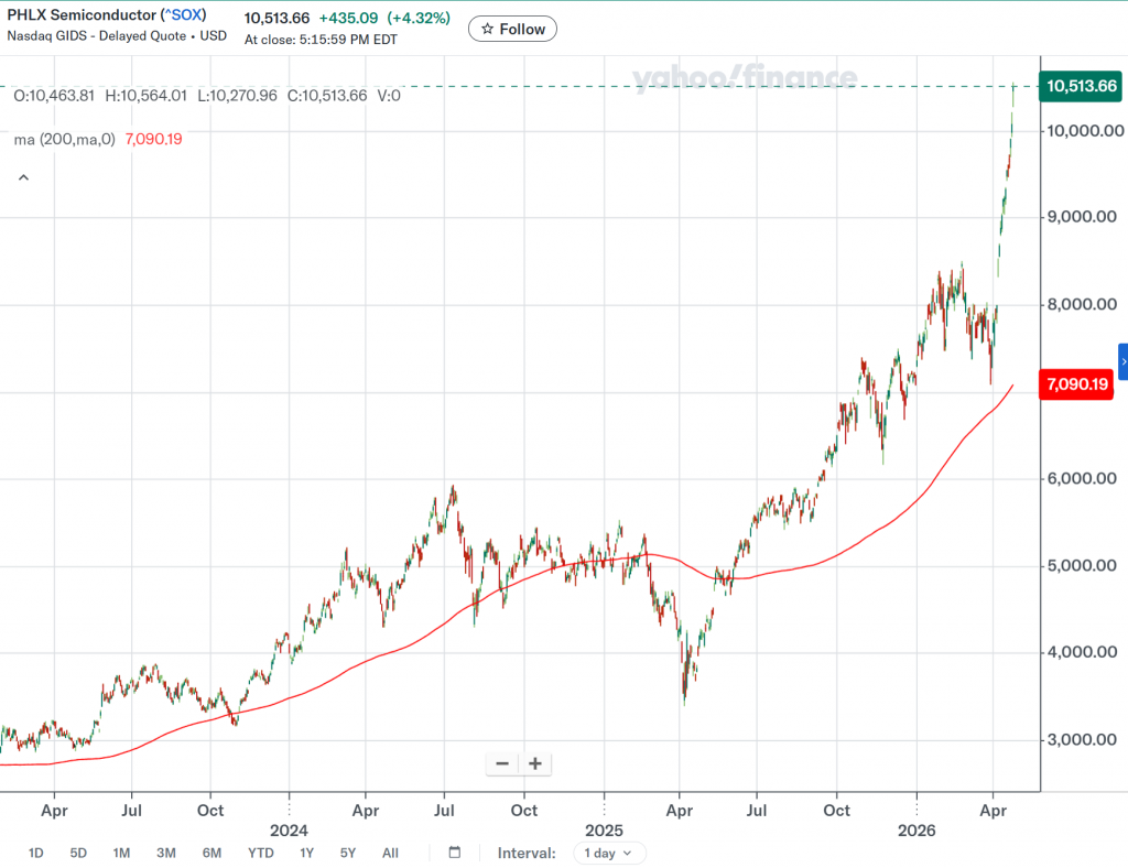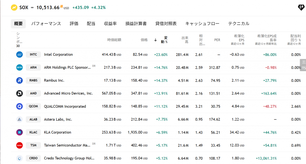 例えば…半導体のSOX指数です。このチャートが、その指数の最近の値動きです。そうして下が、昨日の米国株の5%以上値上がりしたSOX指数の構成銘柄です。このSOX指数は半導体株の30銘柄で構成されています。他の銘柄も、その多くが3%以上の値上がりをしています。時価総額の大きなエヌビディア(NVDA)も4.32%の株価上昇です。
