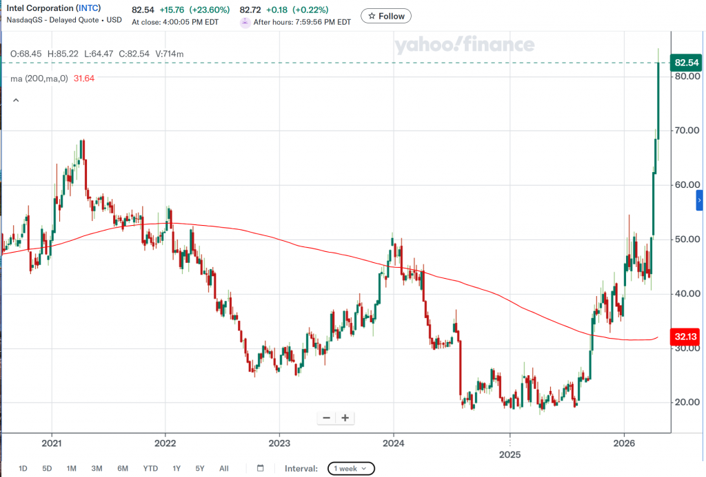 「ロームの謎」の意味を、昨日のインテルの株価を観て…ようやく理解できそうです。このインテル(INTC)は、長年…半導体も、AI相場も関係ない…世界の圏外に追いやられていました。昨年の夏ごろ…米国政府(20.47ドル)が89億ドル、ソフトバンク(23ドル)は20億ドルを出資して、息を吹き返したイメージです。